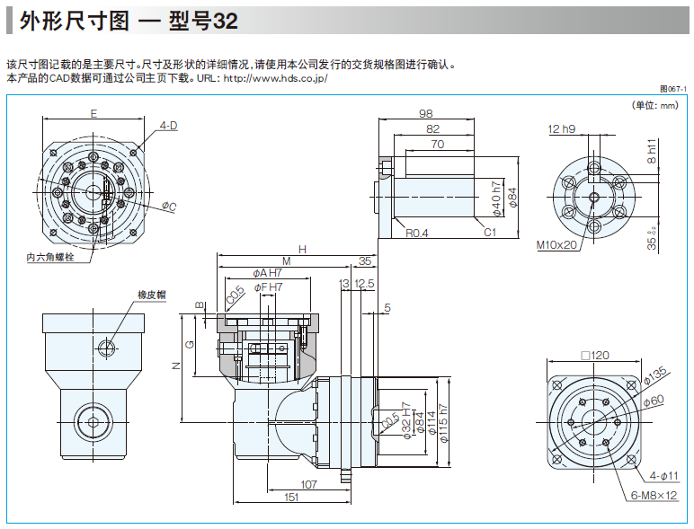 HPG-RA行星減速機是高精度行星齒輪減速機,可簡單的安裝到各公司的伺服電機上。 諧波發生器:橢圓形凸輪的外圈上嵌入薄型的滾珠軸承,整體呈一橢圓形狀的零件。軸承的內圈固定于凸輪之上,外圈則介由滾珠彈性變形。一般安裝在輸入軸上。 柔輪:具有薄壁杯型的金屬彈性體的零件。杯的開口部外圈刻有齒形。柔輪的底部稱為膜,通常安裝到輸出軸上。 剛輪:剛性環狀的零件。內側上刻有與柔輪同樣大小的齒形,且比柔輪多2個齒數。一般固定在外殼上。
